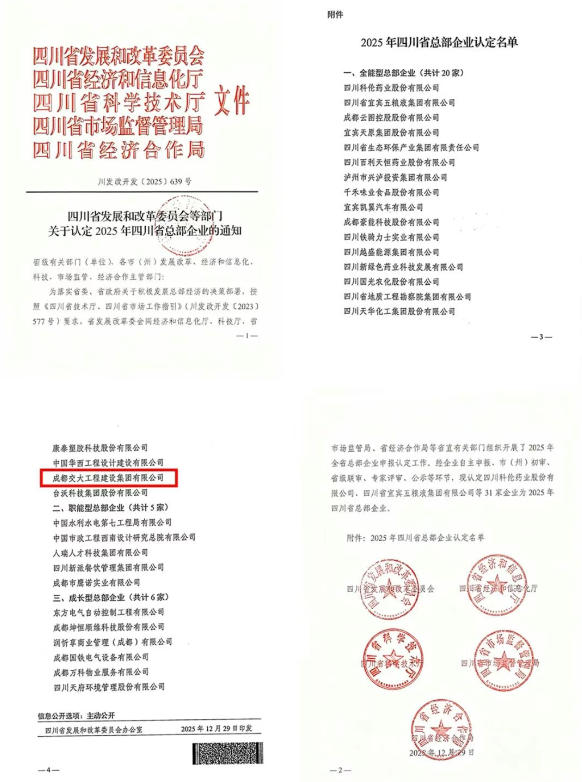 近日,四川省发展和改革委员会联合经济和信息化厅、科技厅、省市场监管局、省经济合作局正式印发《关于认定2025年四川省总部企业的通知》(川发改开发〔2025〕639号),经企业申报、多级审核、专家评审及社会公示等严格程序,成都交大工程建设集团有限公司成功入选“2025年四川省总部企业”名单,并被认定为 “全能型总部企业”。